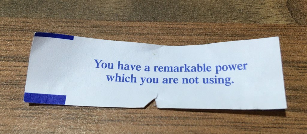 The power of leadership March 14, 2021 ~ gmarkall You receive a fortune cookie. Break it open. Inside: A message Share this: Click to share on X (Opens in new window) X Click to share on Facebook (Opens in new window) Facebook Like Loading...